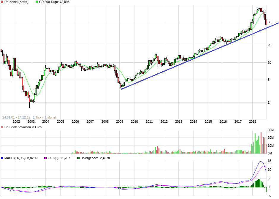 Technisch ist der Aufwärtstrend noch intakt. Man könnte insofern einen Trade mit Kuf 40-42 € und Verkauf 46-48 € hoffen. Aber das wäre wirklich nur ein Trade. Langfristig würde ich die Aktie aus angesprochenen Gründen nicht halten.