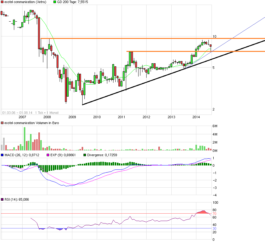 Ecotel war irgenwei auch prädestiniert für so eine Attacke von Kursdrückern. Bei 8,2 € die markante Chartunterstützung und marktenger Titel. Zudem ist der 1.August natürlich nochmal ein gefundenes Fressen, da bei allen Aktien die Monats-Ultimo-Orders aus den Orderbüchern verschwanden und somit das Xetra-Bid heute früh bei einigen nebenwerten richtig leer war. Da konnte man mit einer kleinen verkaufsorder eine echte SL Welle und Kurse 10-15% unter dem gestrigen auslösen. Ecotel war perfekt dafür.