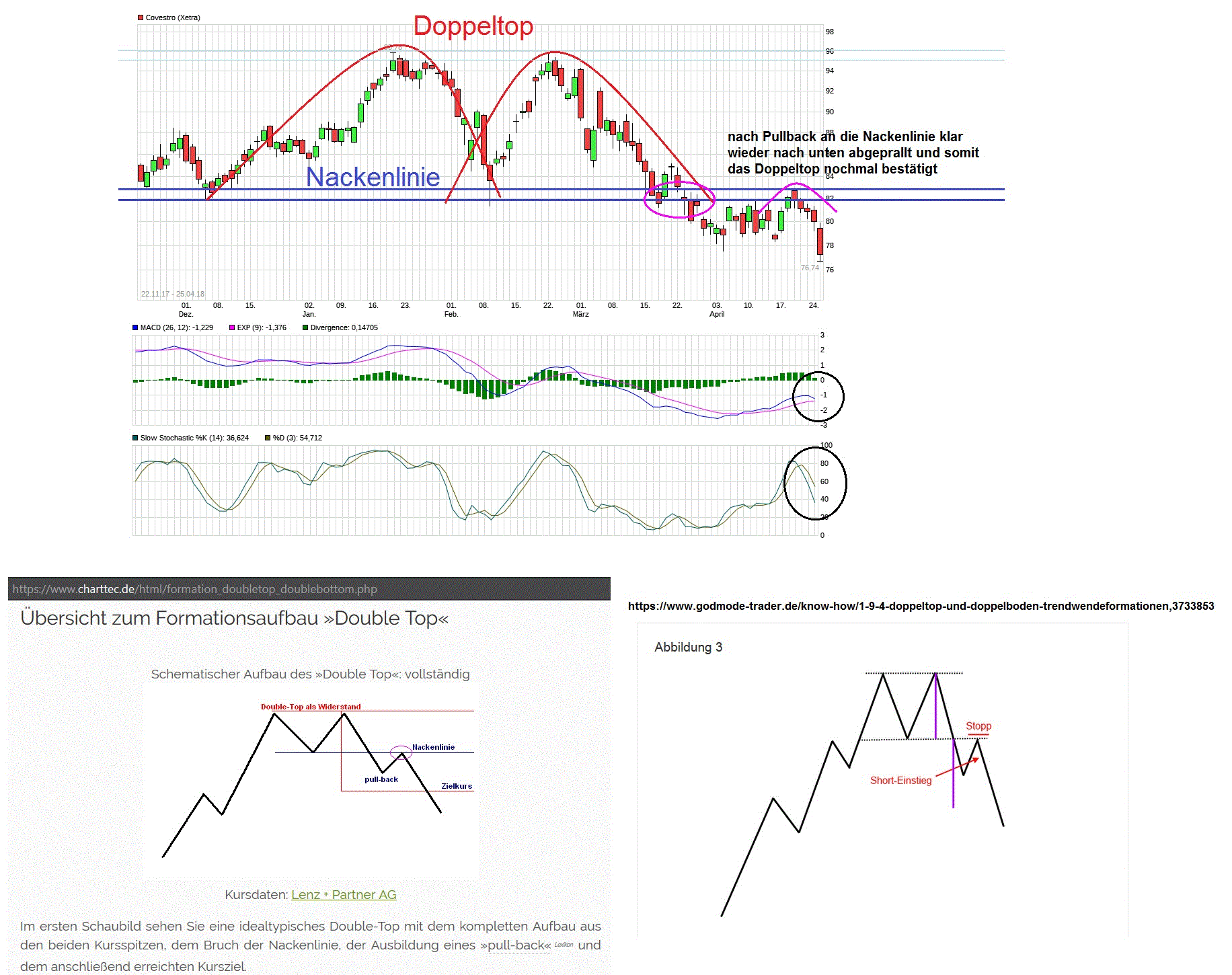 Man sollte Bodenbildungen besser abwarten bis sie wirklich abgeschlossen sind. Zu schnelle Käufe können sich als ungünstig erweisen, wenn man vorschnell schon etwas als abgeschlossen ansieht (was durch den Wunsch danach vielleicht auch zu vorschnell gesehen wird). Solange keine klare nachhaltige Bodenbildung erkennbar ist ( was gegenwärtig noch der Fall ist), kann eben eine kurze Aufwärtsbewegung bei einer vorhergehenden SKS oder einem Doppel-Top nur nochmal ein bestätigender Pullback sein an die zuvor durchbrochene Signallinie / Nackenlinie. Das kommt sehr oft vor und deswegen sind oftmals genau dies die Punkte wo dann Shorties gerne aufspringen. Entsprechend muß man also schauen, ob sich die Abwärtsbewegung nach dem Pullback fortsetzt oder man nochmal einen weiteren Angriff auf die Nackenlinie macht. Solange die Region 82/83 nicht nachhaltig wieder überwunden ist und dann verteidigt wird, solange wäre ich hier erstmal durch das noch immer bestehende Doppeltop vorsichtig. Schauen wir also mal wie der Kurs dann die jetzt kommenden frischen Zahlen und besonders das Prognoseupdates aufnimmt.