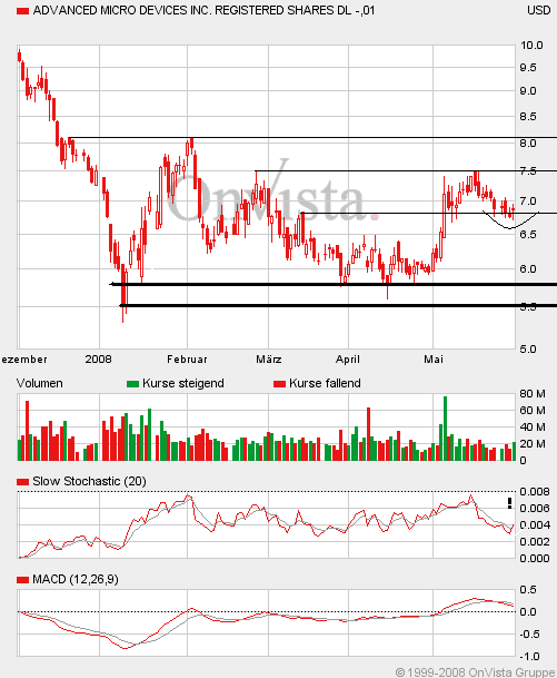 Die aktuellen Probleme überschatt­en dies jedoch. Ich hab zurzeit keine AMD-Aktien­. Würde auch erst nach einer deutlichen­ Korrektur des Gesamtmark­tes (bzw. des Nasdaq) in Tech-Aktie­n investiere­n. Der Nasdaq könnte im Zuge der US-Rezessi­on bis 2010 noch 30 bis 50 % nachgeben.­ Man kann daher in Ruhe abwarten, ob es AMD dann überhaupt noch gibt ;-)