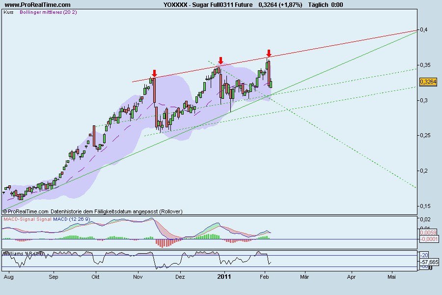 Gleichzeitig führt die Unterstützungslinie nunmehr in eine Dreiecksformationen, die sich in den nächsten zwei Monaten auflösen sollte. Fraglich bleibt, welche Richtung dann eingeschlagen wird. Ich werde zumindest mein Zuckerinvestment zurückfahren, bis wir den Trendkanal nach oben oder unten verlassen haben und sich wieder ein eindeutigeres Chartbild ergibt.