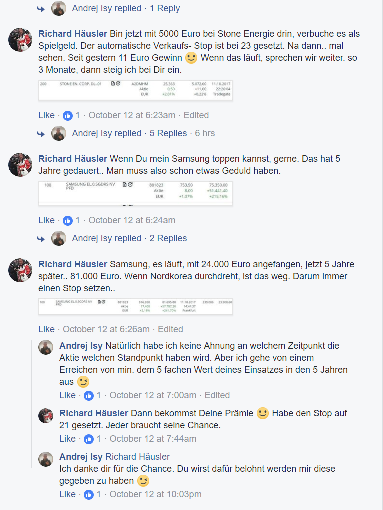 Hier ist die Konversation in der man sieht wann der Herr deinen Rat befolgt hat und auch wie er den Stoploss zuerst auf 23€ und dann auf 21€ gesetzt hat.