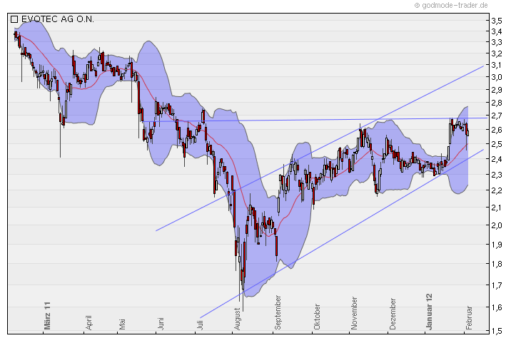 Anfang Mitte Sept. ist Evotec am oberen Rand des Aufwärtskanal angestoßen, kam nicht darüber und viel zurück. Anfang November derselbe Vorgang. Im Moment tut sich Evotec schwer den Widerstand bei 2,69€ zu überwinden.