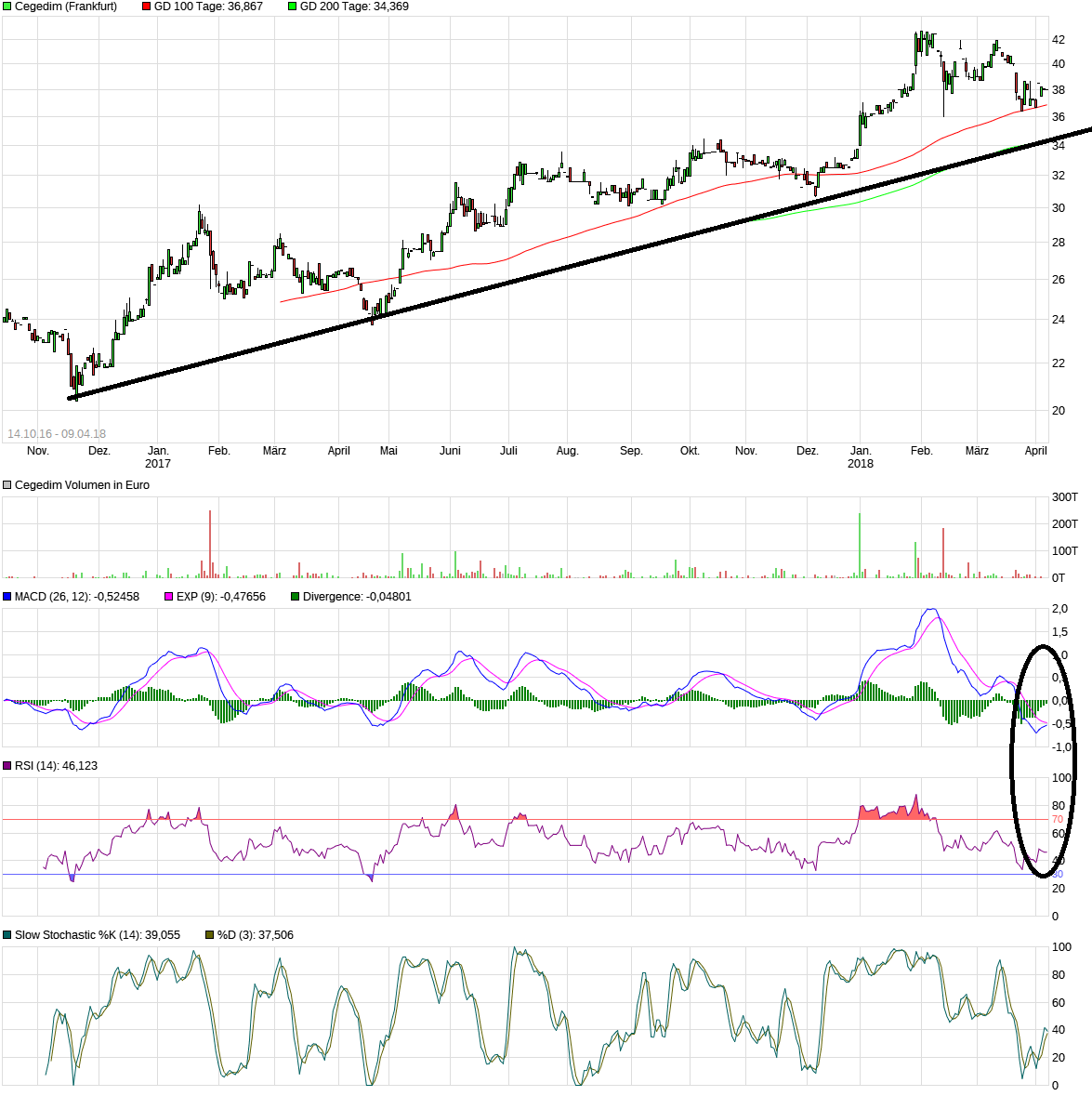 Wenn der Aufwärtstrend bei 34 € verläuft (sehe ich auch so), dann müsste man doch bei 34-35 € prozyklisch, trendbestätigend kaufen. Du hingegen willst auf den Trendbruch warten und erwartest Kurse von 32 €. Um dann zu kaufen?