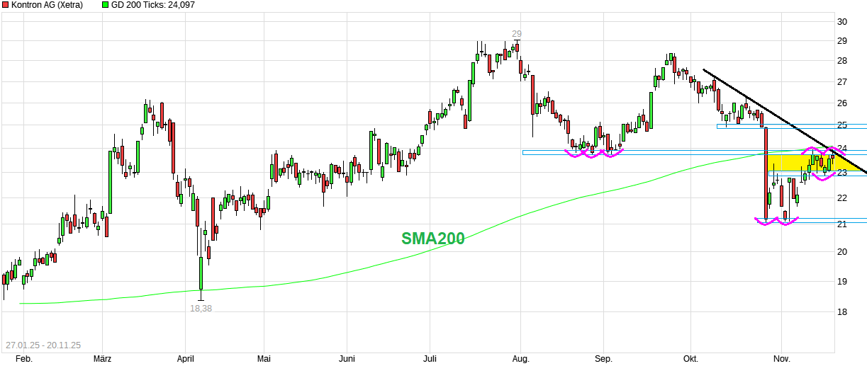 dickes Brett im Bereich 23,70/24,00 Die Kurserholu­ng ist ja seit einigen Tagen ins stocken geraten. Man kommt nicht durch die horizontal­en Widerständ­e im Bereich  von 23,70/24,0­0€ bzw. die Tiefs von Aug. /Sept.25. Gleichzeit­ig ist man auch an der 200 Tagelinie wieder nach unten abgeprallt­. Jetzt muß man umgekehrt mal schauen, ob sich wenigstens­  um die 23erMarke eine kleine Unterstütz­ung ausbilden kann oder nicht.