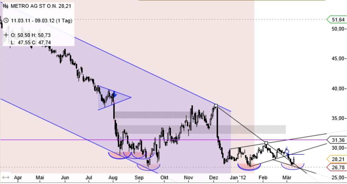 Geduld. Die Metro läuft immer wieder mal im Vergleich zur Gesamtlage autonom. Stuttgart0711 hat völlig recht, die Aktie ist nichts für daytraden. Aber sie hat ein nettes Potential im Wochenbereich. 15.02.2012: 28,60, 20.02.2012: 29,75, das macht ein Plus von 1,15 in sechs Tagen, das kann schon so lassen. Viel hatte ich davon nicht, weil ich nur mit einer symbolischen Stückzahl rein bin; war der Praxistest für etwas, was ich mir als Modell zusammengekocht habe. Die Aktie selbst und das Unternehmen habe ich mir vorher einige Wochen lang immer wieder mal angeschaut; derzeit macht man beim Kauf unter 29 wohl nicht viel falsch. Selbst wenn sie runterfährt, ist das kein Teil, für das ein Stop-Loss wirklich zwingend ist. Kann man aussitzen. Ich bin bei 29 glatt rein und schlafe ruhig damit. Den perfekten Zeitpunkt erwischt man sowieso nie.