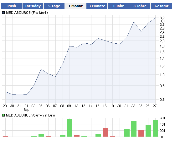 Die Aktie der Mediasource AG ist in den letzten Wochen um mehr als 1000% gestiegen. Es häufen sich Spekulationen über eine Mantelverwertung der entschuldeten AG. Die Aktie bleibt weiterhin HOT mit einem persönlichen Kursziel von 4€