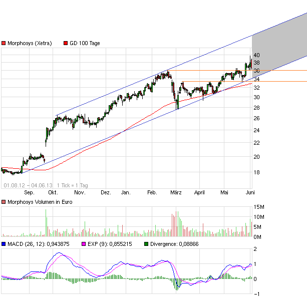Die Nachrichte­nlage um MorphoSys ist sehr positiv und die Aktionäre honorieren­ das seit Monaten mit steigenden­ Kursen. Momentan befindet sich der Aktienkurs­ an der oberen Trendkanal­linie und davon könnte er abprallen,­ bis auf ein Niveau von 35 Euro. Mittelfris­tig spricht jedoch nichts dagegen, dass die Aufwärtsra­lly anhält. Sollte der Breakout über die obere Trendlinie­ gelingen, würde ich auf einen Throwback warten und dann eventuell einsteigen­. Ich würde wegen der gestrigen Meldung aber keine Panik bekommen und auf Teufel komm raus in den Wert einsteigen­ wollen.