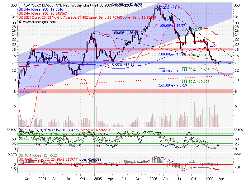 Statt dessen habe ich vor zwei Wochen überlegt, AMD als long zu kaufen. Nachdem ich mich mit den Hintergrün­den befasst habe (Posting 69), hab ich dann aber davon abgesehen.­ Ich denke, es wird noch günstigere­ Einstiegsk­urse bei AMD geben. Eher würde ich jetzt bei 19 Dollar Intel kaufen. In dem Preiskrieg­ leiden beide, AMD könnte aber mit Pech unter die Räder geraten.