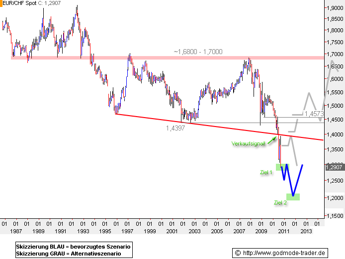Rückblick: Der Euro gerät gegenüber dem Schweizer Ende weiter unter Druck, der August war mit einem Wertverlust von 7,3 % ein rabenschwarzer Monat für den Kursverlauf von EUR/CHF. Die bereits im Mai dieses Jahres geäußerten Bedenken hinsichtlich eines drohenden Kursrutsches des Euros haben sich bestätigt, das erste der genannten Ziele bei 1,2800 - 1,3000 CHF ist nun erreicht (bitte hier klicken, um zur Ausgangsanalyse zu gelangen).
