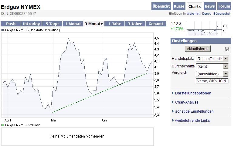 Im Moment kostet der GAS-Schein = 0,82 / 0,84 EUR. Heute 10,99% im Minus! NYMEX NATURAL GAS Nur ein Beispiel: Gibt es was Besseres? Dann bitte hier vorstellen! | |
