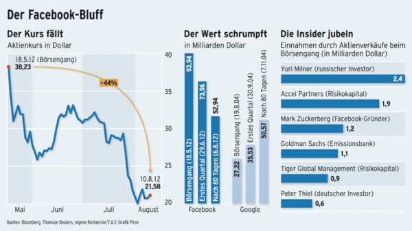 Irgendwie war es doch vorauszusehen dass die Aktie fallen wird. Die Leute waren zu euphorisch und unüberlegt als sie sich die Aktien des „Riesen“ facebook zulegten. Zuckerbergchen geht da sicher fein aus der Sache raus…