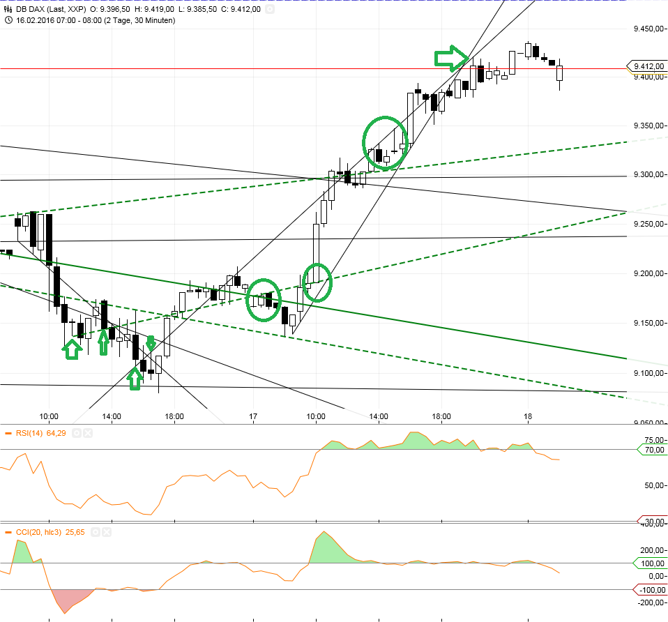 Eins noch vergessen, der obere Pfeil bedeutet, dass das steigende Dreieck abgearbeitet ist. So war es jedenfalls in der Vergangenheit. (30er Chart) In der Std müssen wir uns noch gedulden. Werde dann aber das hier schreiben.