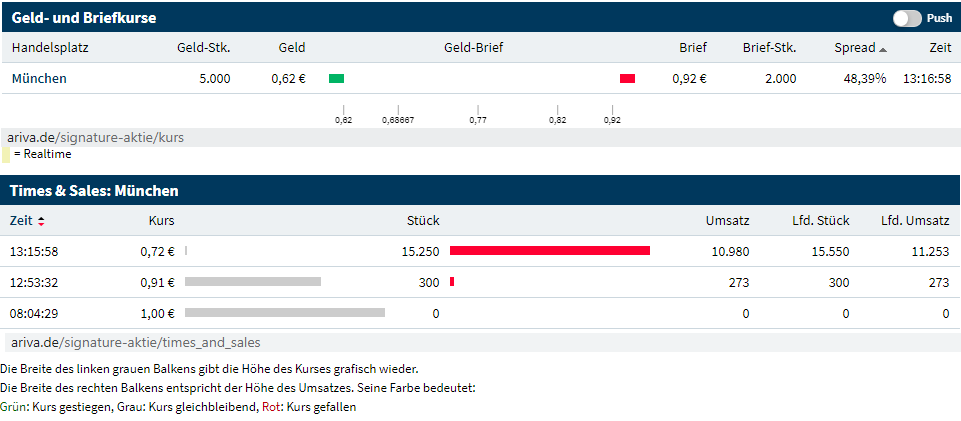 Wer verkauft dort unlimitiert in so einer Aktie?? Bzw warum ist der Handel in München noch möglich?? Beides scheint inzwischen vorbei sodass signature wohl nun wieder steigen kann.