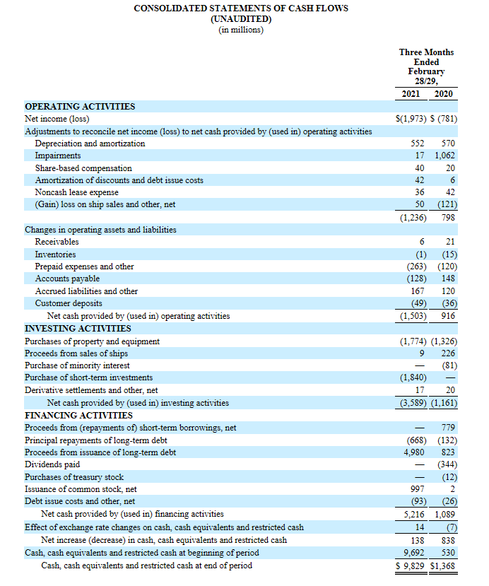 Operativ wurden 1,5 Mrd USD an Cash verbraucht, neue Darlehen über 5,2 Mrd wurden aufgenommen.