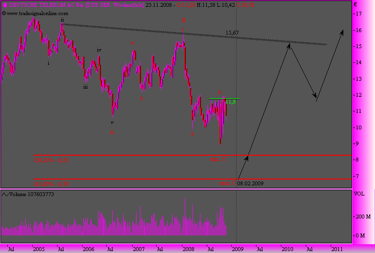 Charttechnischer Ausblick: Für Aktionäre der Deutschen Telekom dürfte nun wieder einmal eine schwere Phase beginnen. Abgaben bis ca. 6,20 Euro sind in den nächsten Wochen und Monaten zunächst einmal zu erwarten, wenn die Aktie per Monatsschlusskurs unter 8,14 Euro abfällt, so wie es sich aktuell andeutet.
