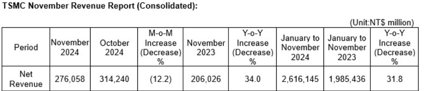 HSINCHU, Taiwan, ROC – 10. Dezember 2024 – T SMC (TWSE: 2330, NYSE: TSM) gab heute seinen Nettoumsatz für November 2024 bekannt: Auf konsolidierter Basis betrug der Umsatz für November 2024 rund 276,06 Milliarden NT$, ein Rückgang von 12,2 Prozent gegenüber Oktober 2024 und ein Anstieg von 34,0 Prozent gegenüber November 2023. Der Umsatz für Januar bis November 2024 belief sich auf insgesamt 2.616,15 Milliarden NT$, ein Anstieg von 31,8 Prozent gegenüber dem gleichen Zeitraum im Jahr 2023.
