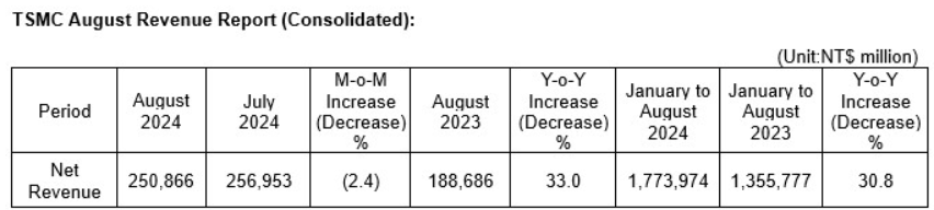 HSINCHU, Taiwan, ROC – 10. September 2024 – T SMC (TWSE: 2330, NYSE: TSM) gab heute seinen Nettoumsatz für August 2024 bekannt: Auf konsolidierter Basis betrug der Umsatz für August 2024 rund 250,87 Milliarden NT$, ein Rückgang von 2,4 Prozent gegenüber Juli 2024 und ein Anstieg von 33,0 Prozent gegenüber August 2023. Der Umsatz für Januar bis August 2024 belief sich auf insgesamt 1.773,97 Milliarden NT$, ein Anstieg von 30,8 Prozent gegenüber dem gleichen Zeitraum im Jahr 2023.