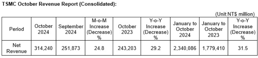 HSINCHU, Taiwan, ROC – 8. November 2024 – T SMC (TWSE: 2330, NYSE: TSM) gab heute seinen Nettoumsatz für Oktober 2024 bekannt: Auf konsolidierter Basis betrug der Umsatz für Oktober 2024 rund 314,24 Milliarden NT$, ein Anstieg von 24,8 Prozent gegenüber September 2024 und ein Anstieg von 29,2 Prozent gegenüber Oktober 2023. Der Umsatz für Januar bis Oktober 2024 belief sich auf insgesamt 2.340,09 Milliarden NT$, ein Anstieg von 31,5 Prozent gegenüber dem gleichen Zeitraum im Jahr 2023.