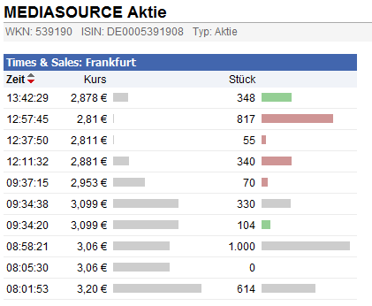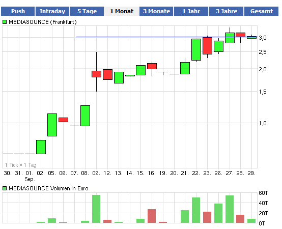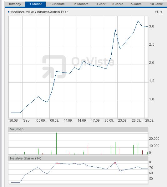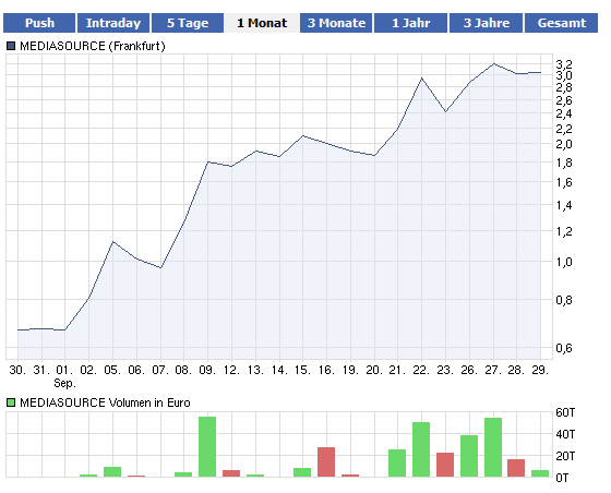 dass die Story weithin viel zu unbekannt ist, kein Mensch kennt Mediasource, kein Mensch hat die News gelesen. Aber das birgt auch Potenzial für den Fall, dass mal ein Börsenbrief oder eine Zeitschrift darauf aufmerksam werden sollte.