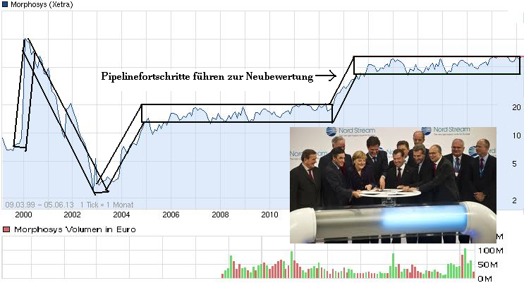 Ein führendes Partnerprojekt ist Gantenerumab von Roche gegen Alzheimer. Bei positiver Zwischenauswertung kann alleine dieses Programm weitere satte Kurssprünge auslösen. Weitere fortgeschrittene Projekte mit Chancen auf P3-Studien in den nächsten 2 Jahren sind vor allem BPS804, BYM338 und LFG316 von Novartis sowie CNTO1959 von Johnson&Johnson. Die Chancen hier einzeln zu besprechen würde den Rahmen bei weitem sprengen, aber klar ist eines: Aus diesen und vielen weiteren Programmen ist in den nächsten 2 Jahren eine Menge an klinischen Daten und Entscheidungen zu erwarten, mit entsprechendem Einfluss auf den Morphosys-Kurs."