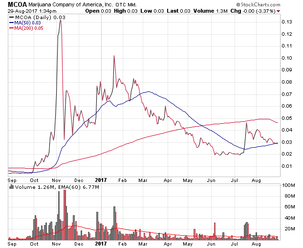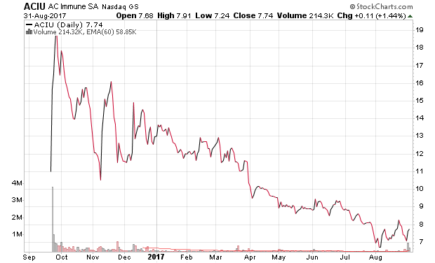 Die Charts dieser beiden Cannabis-Biotechunternehmen sind nicht gerade geeignet, großes Vertrauen in deren Potenzial zu wecken. Hier der Chart zu ACIU, ein Newcomer mit einer aktuellen Marktkapitalisierung von 446 Mio. $, der permanent das Geld der Anleger in großem Maßstab verbrennt.