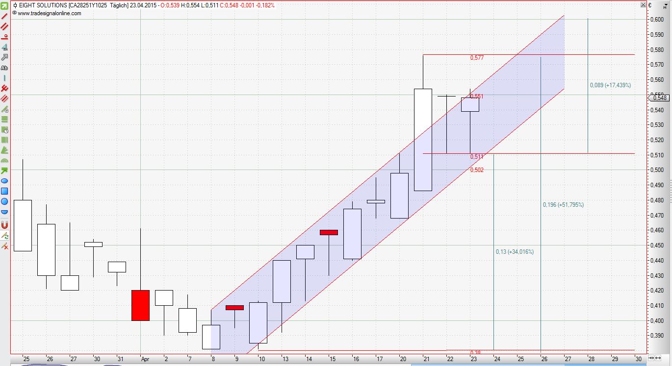 in die endlich andere Richtung lässt sich auch langsam abzeichnen. Das schöne daran ist, dass z. Zt. keine größeren Abschläge mehr gibt, wie so oft in den letzten Szenarien. Das ist meines Erachtens richtig positiv und bringt auch Vertrauen zurück. Trotz des soliden Chartverlaufes sind wir im (Bid) innerhalb der letzten 14 Tage um 34% gestiegen. Das ist höchst erfreulich. Sollte sich der Trend fortsetzen, könnten wir bereits Ende April (also nächtse Woche) die 0,60€ im Bid (weiter +17%) sehen. Dann sollte es hoffentlich bei guter Nachrichtenlage auf 0,85€ wie von unexplained geschrieben , gehen.