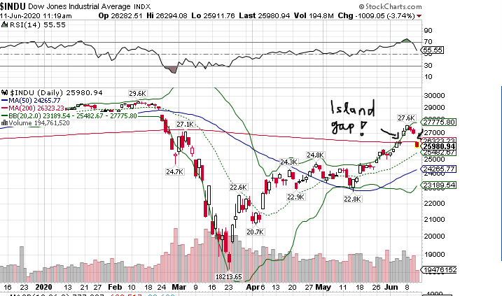 Ganz einfacher Grund hierfür, denn wir haben im Tages-Chart heute ein island gap. Das bedeutet ein vorherige gap (up) wurd geschlossen, aber erneut durch ein gap diesmal aber down. Weitere Kursrückgänge sind daher sehr wahrscheinlich. Nach langer Zeit ist das ein Grund heute endlich wieder eine kalte Whisky-Flasche aufzumachen! Ach ganz nebenbei wurde auch noch die 200-Tagelinie heute wieder unterschritten...