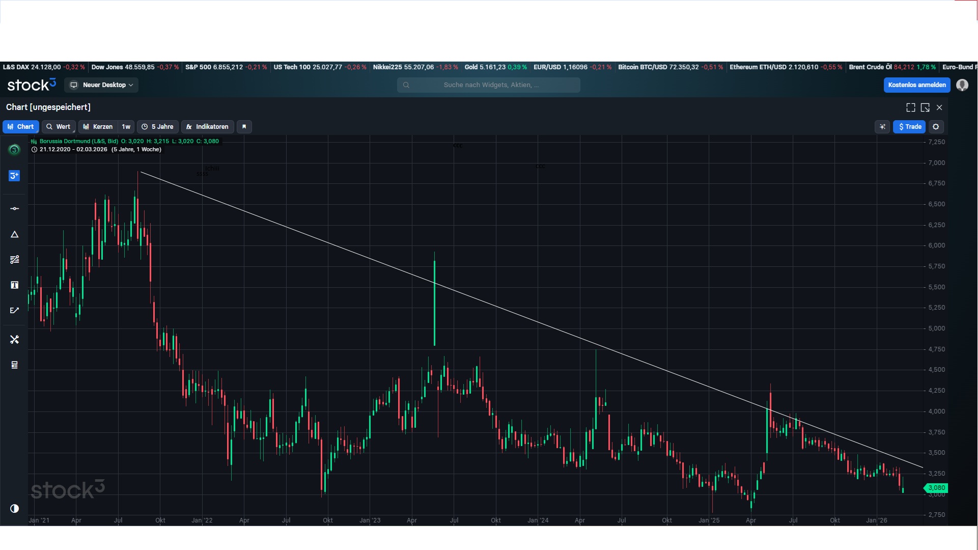 Aber NEIN die Gier war scheinbar stärker als der Verstand und man hat von BVB Aktien in OS oder KO Scheine umgeschichtet und nur so war es scheinbar möglich statt 55 % Minus auf über 80% Minus zu kommen. Das ist Sportlich.....bekommen nur wenige hin. Wie es die letzten 5 Jahre bis Dato lief sieht man am Chart, deswegen seltsam das der Betreiber dieses Wiki, anderen für irgendetwas Vorwürfe macht oder den Eindruck erwecken möchte das er es besser gemacht hätte.