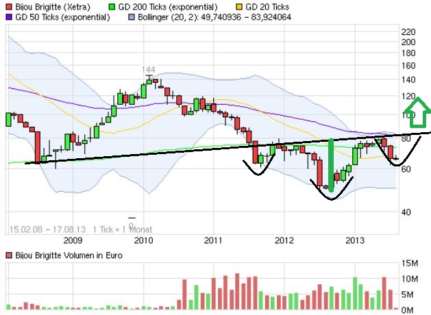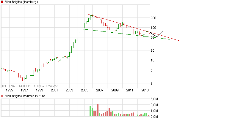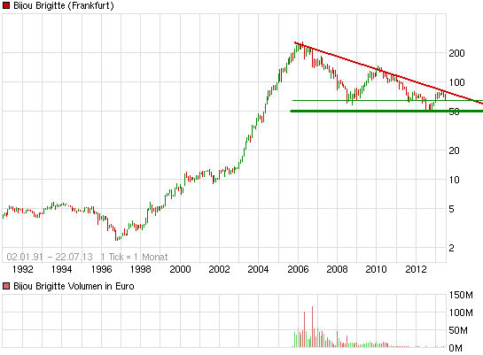 Denke man bekomt bei Bijou bald die letzte Chanche zwischen EUR 50 und 60 zuzuschlagen! Immerhin ist Bijou schuldenfrei und das Eigenkapital deckt gute EUR 20 des Börsenkurses ab. Langfristig hat Bijou mit den eingeleiteten Maßnahmen des letzten Jahres die Weichen für einen Wiederaufstieg gestellt!