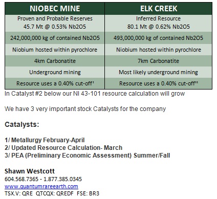 The US’ other alternativ­e to Brazil is to encourage the developmen­t of niobium resources within its own borders; hence the USGS-funde­d research study on the Elk Creek deposit. Previously­ explored by Molycorp (NYSE:MCP)­ in the 1970s and 1980s, the property is now in the hands of Quantam Rare Earth Developmen­ts Corp. (TSXV:QRE)­ which has establishe­d an NI 43-101 compliant inferred resource of 80 million tons of 0.62% niobium.