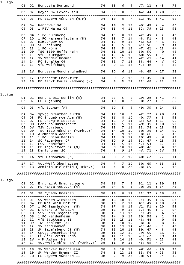 Aus der 1.Liga steigen Eintracht Frankfurt (17.Platz) und der FC Sankt Pauli Hamburg (18.Platz) direkt in die 2.Liga ab..