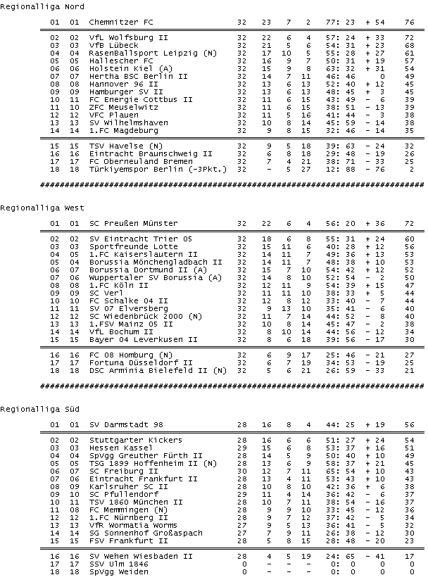 In der Süd balzen sich noch der SV Darmstadt 98 und die Stuttgarter Kickers um den Aufstieg.. Hessen Kassel hat es tatsächlich noch verdaddelt, nachdem es schon mehr als deutlich nach Aufstieg roch... Aus die Maus für Kassel..