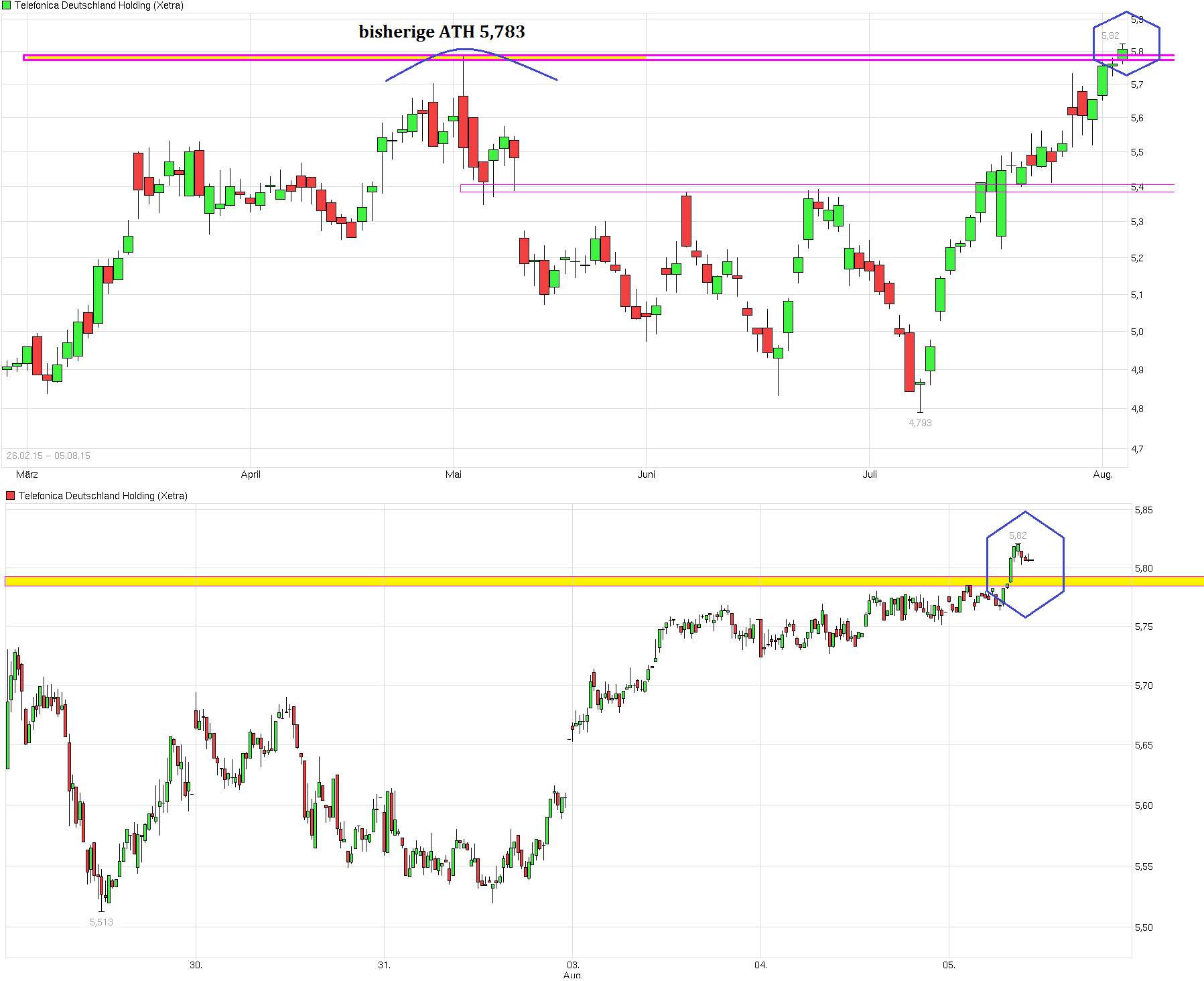 auch noch hin, um ein neues Allzeithoch zu machen? Xetra-Top von heute bislang 5,777. Bisheriges ATH 5,783. Die Branche hat die letzten Wochen fast geschlossen mit guten Zahlen überzeugen können. Die allgemeine Konsolidierung in der Branche und der anhaltende Trend zu Verträgen mit größerem Datenvolumen treibt das Geschäft weiter an. Und so steht z.B. mit Freenet ein anderer TecDax-Wert aus der Branche auch aktuell nurnoch wenige Cent unter einem neuen Allzeithoch. Mal schauen, ob Telefonica Deutschland oder FNT es eher schaffen wird das alte Top zu übertreffen.