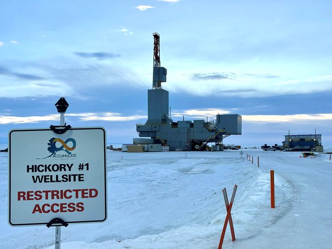 nvestor-Präsentation Februar 2023. Hickory-1-Bohrloch „Chance auf Öl wurde für alle Ziele mit 100 % bewertet, mit Ausnahme der Kuparuk-Formation, die mit 70 % bewertet wurde“ (kleine helle Schrift) in Folie 15.