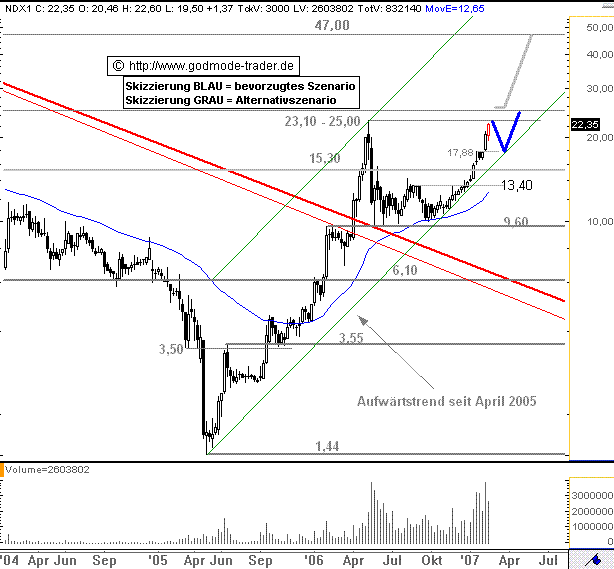 Kurz-Kommentierung: Die NORDEX Aktie legt seit dem Ausbruch über den Widerstand bei 13,40 Euro aus der letzten Woche des alten Jahres deutlich zu. Sie nähert sich bereits stark dem avisierten Zielbereich bei 23,10-25,00 Euro an. Da die Aktie aus indikatorentechnischer Sicht bereits wieder stark überkauft ist, sollte sie dort zunächst abprallen. Ein Rücksetzer bis ca. 17,88 Euro und damit auch auf den langfristigen Aufwärtstrend wäre keine Überraschung. Bricht die Aktie dann anschließend über 25,00 Euro aus, wäre eine weitere Rallye bis ca. 47,00 Euro zu erwarten.
