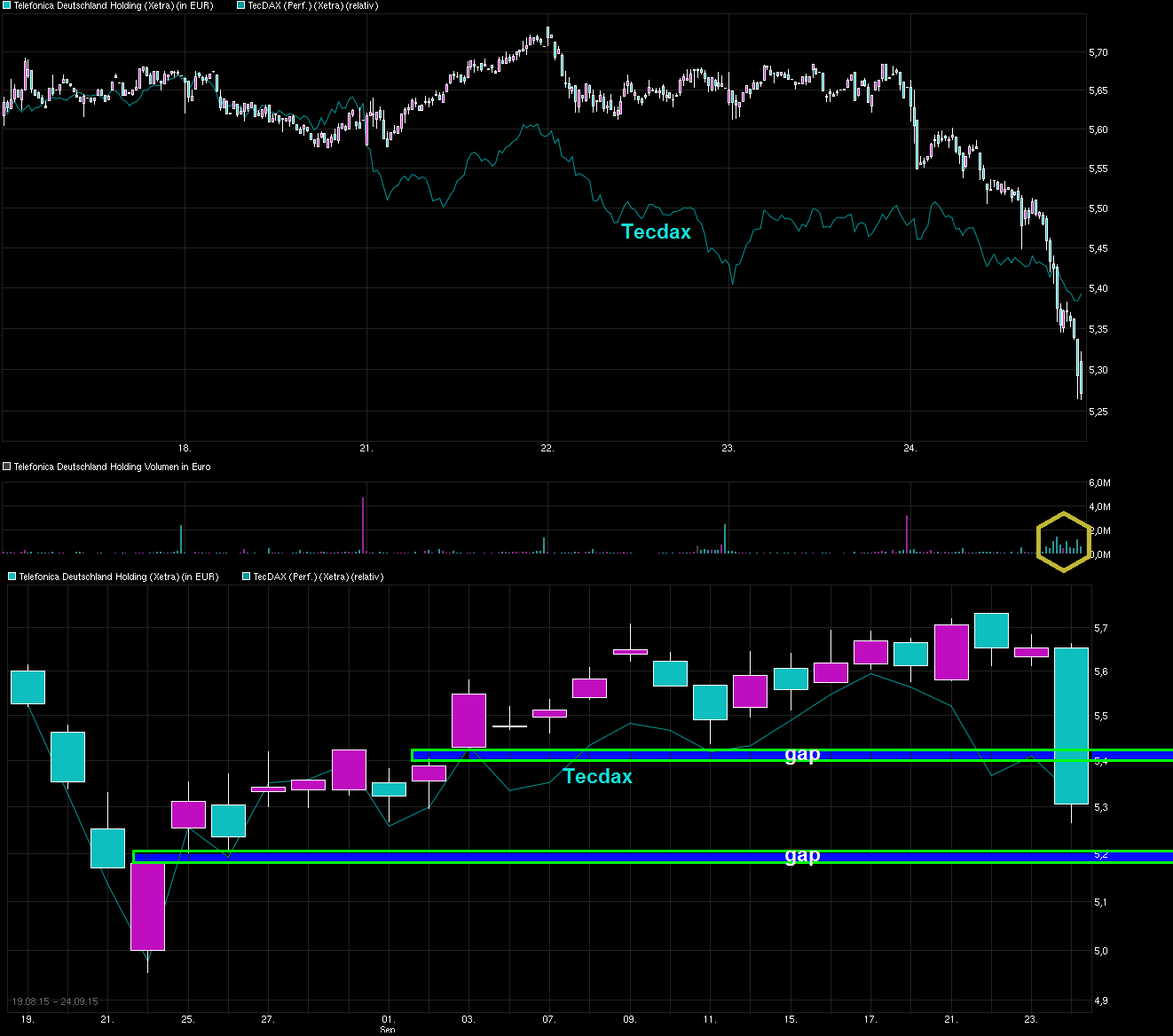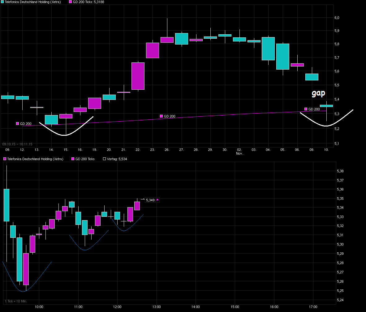Du bis nicht der Einzigste der sich freut :) Die Aktie von Telefonica Deutschland habe ich ja schon länger und sehe das Ganze eigentlich ganz entspannt. Durch die Fusion mit E+ mag es zwar in diesem Jahr etwas mehr Aufwand geben wg. der Integrationkosten, aber die Synergieeffekte und der Wegfall des ständigen Preisdumpings von E+ , sollten die kommenden Jahre eine solide Basis für stetiges, wenn auch nicht zu dynamisches Wachstum mit solider DiviRendite bringen. Die Telkos waren ja schon die letzten Tage recht gut un( =>http://www.ariva.de/news/...echst-wieder-und-erhoeht-Prognose-5529073 ), wo der Sektor als Ganzes schon am Vormittag schon aufwachte und Draghi hat dann auf der EZB-PK ab 14:30 das Übrige hinzugetan. Man schaue sich mal an wie heute andere Aktie als Telefonca Deutschland in der Peer Group gelaufen sind, wie z.B. Dt. Telekom, Vodafone, Telefonica S.A., Freenet, etc. Alle schön durchgestartet. Scheint als würden die Zahlen von Orange die Hoffnung wecken, daß auch die anderen größeren Player demnächst bei den Q.3 Zahlen überzeugen. Bei Telefonica Deutschland ist man jetzt genau am Abw.trend der letzten Monate angekommen. Wäre schön, wenn man den jüngsten Schwung mitnehmen könnte, um die Abw.Trendlinie zu knacken, um sich wieder mehr Richtung Jahreshoch zu orientieren ;) Mal schauen, ob Frau Yellen nächste Woche ähnliche Bewegungen im Gesamtmarkt erzeugen kann, wenn sie etwas zum Thema Zinsen sagt. Wäre nicht nett, wenn der mögliche Beginn der Jahresendrallye zu schnell wieder eingebremst würde.