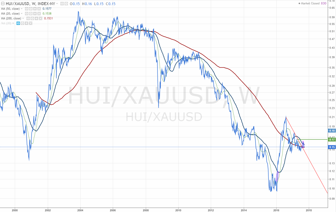HUI/Gold ist auf dem Niveau von 2000 und seit dem Jahr 2003 (bis 2015) fielen diese Aktien relativ zum Gold! Das zeigt welche Kapitalvernichtung diese Aktien bereits seit 2003 sind. Wegen dem viel höhere Risiko zum Gold müssten diese Aktien das Gold deutlich outperfomen, um ein Halten rechtfertigen zu können.