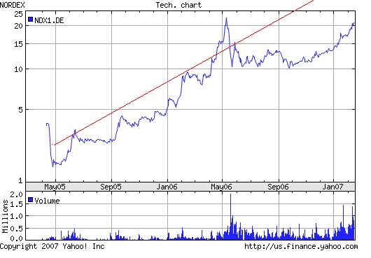 Vor allem dank des stark wachsenden Exportgeschäfts hat Nordex in den ersten neun Monaten des laufenden Geschäftsjahres seinen Umsatz auf 373 Mio. Euro mehr als verdoppelt. Nordex verbuchte einen Gewinn von 6,4 Mio. Euro, nachdem im Vorjahreszeitraum noch ein dickes Minus von 14,6 Mio. Euro zu Buche stand. Auch die Auftragsbücher füllen sich zunehmend. Das Neugeschäft stieg etwa um 84 Prozent auf 515 Mio. Euro. Nordex sieht sich nun auf dem besten Weg, sein Jahresziel zu erreichen. Beim Umsatz sind mehr als 500 Mio. Euro angepeilt. Die EBIT-Marge soll sich auf mehr als drei Prozent belaufen. Für 2007 strebt Nordex ein operatives Wachstum von 50 Prozent und eine Verbesserung der Profitabilität an.
