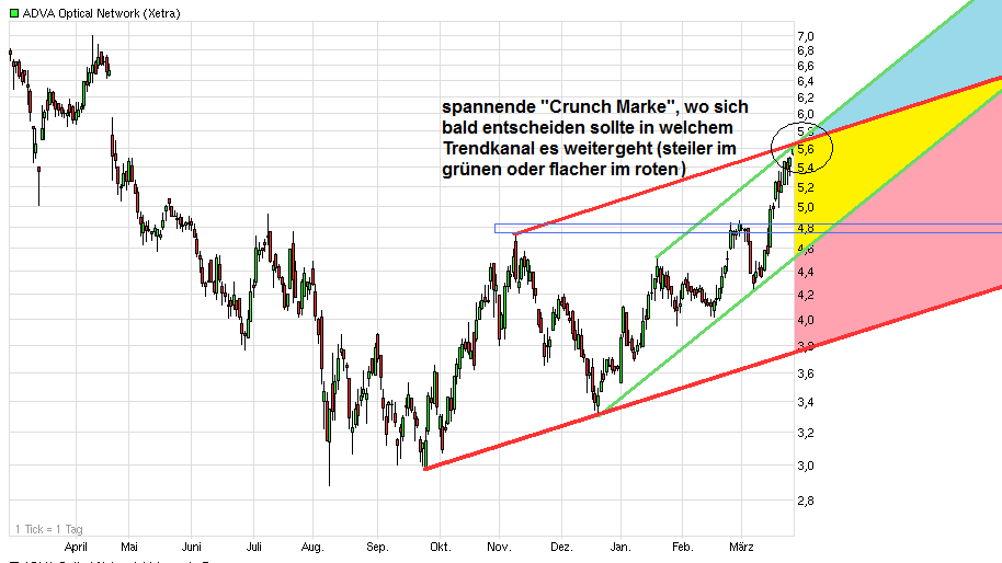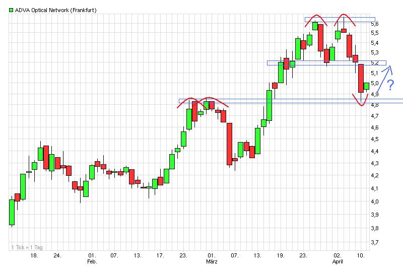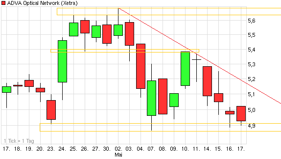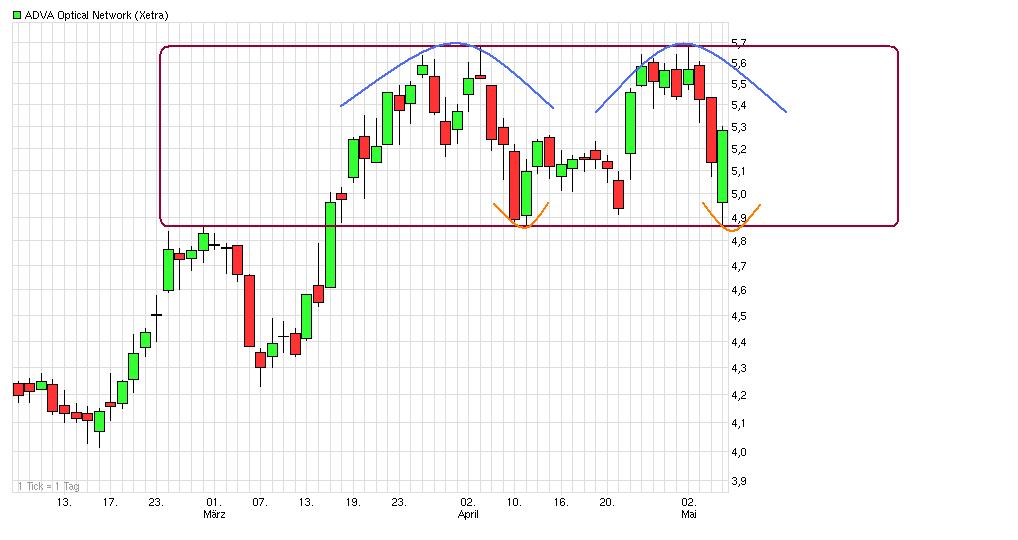 Wieder abgedreht an der Region 5,20/25. Die Nackenlinie des Doppeltop wird also nicht im vorbeigehen so fix wieder überwunden. Und wenn der Gesamtmarkt nicht mitmacht, dann sowieso nicht. Dow exakt an der 13000 wieder nach unten gedreht. Hatte ja in #586 geschrieben, daß dies für mich die Schlüsselstelle ist. DAX scheint die 6600 nicht halten zu können. Könnte jetzt im DAX sogar noch weiter runtergehen in den 6400er Bereich. Vielleicht testet ADVA dann nochmal die Region um die 4,85 an. Muß ich nicht unbedingt haben. Wäre aber denkbar. Zumindest dürfte wohl nicht mehr so eine heftige SL Welle kommen wie jüngst als bei 5,1€ das SL vom "Der Aktionär-TV"-Musterdepot die Musterdepot-Lemminge rausgekegelt hat.