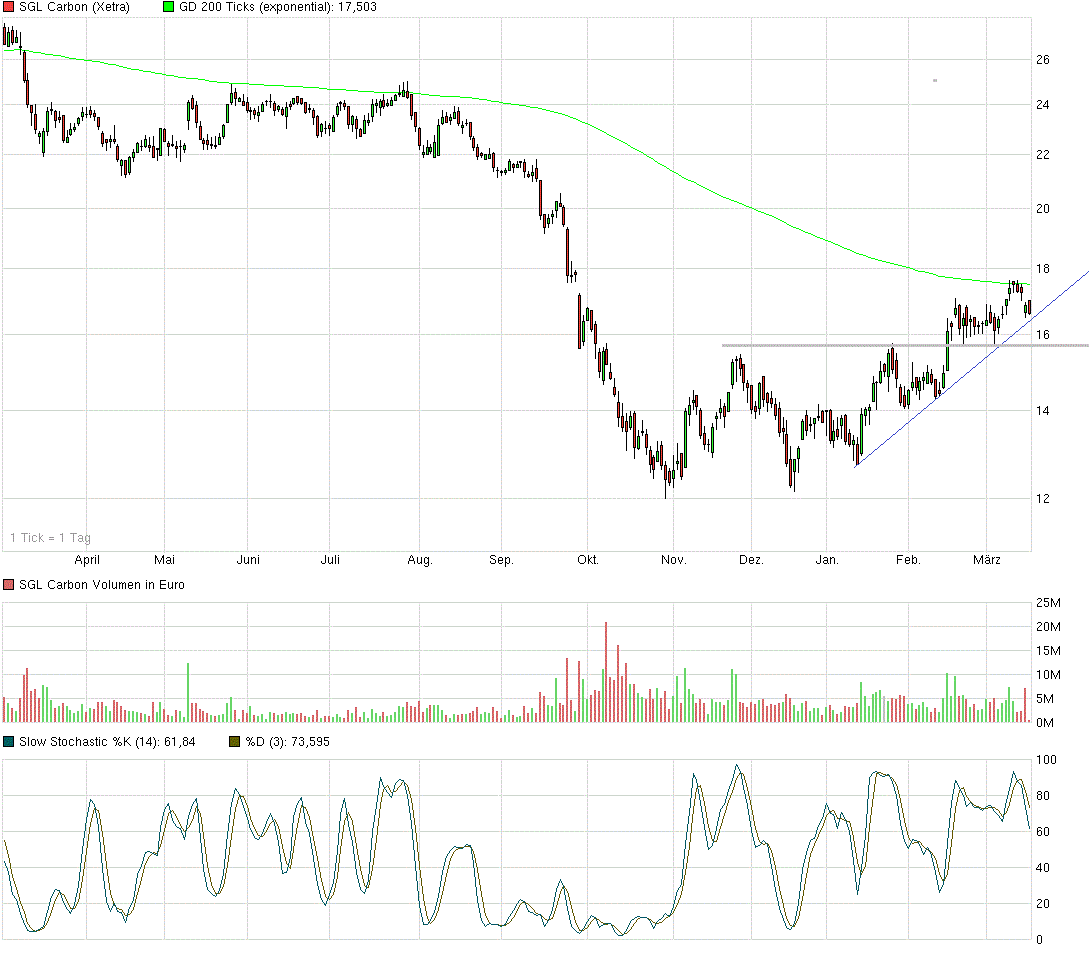 ...das ist das chartbild! und wie du/ihr alle wisst, haben chartbilder nur solange bedeutung, bis nachrichten kommen, die weit aus gewichtiger sind als chart. die sachlage ist ganz einfach. sgl stand anfang januar bei 12,80€. seitdem hat sich der kurs zu spitzen um kanpp 40% erholt, weil alle meinen, dass das schlimmste überstanden sei. sprich: in dem kurs ist schon ein weitestgehend positiver ausblick für 2015 enthalten. entscheidend wird sein, wie schnell der konzernumbau voran geht....vor allen dingen weg vom derzeitigen "hauptmarkt/umfeld" der kohlenstoff- und graphitelektroden (denn durch steitig sinkende preise verdient man damit keinen apple und kein ei mehr). dazu wurde die jüngste kapitalerhöhung komplett vom verlust und den abschreibungen vergangenes jahr vernichtet (ursprünglich geplante profitable abspaltung der tochter hitco ist der volle draufleger)