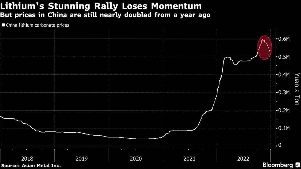 Der unaufhaltsame Anstieg des Lithiumpreises seit 2020 hat den Käufern geschadet und zum ersten jährlichen Anstieg der Batteriekosten seit Beginn der Beobachtung durch BloombergNEF vor fast einem Jahrzehnt beigetragen. Die Benchmark-Preise in China sind immer noch etwa doppelt so hoch wie Anfang 2022 – obwohl sie in diesem Monat gesunken sind –, da die Nachfrage des schnell expandierenden Elektroauto-Sektors das Angebot übersteigt.