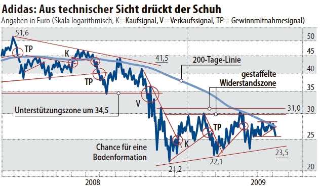 2009 aber zum Rutsch durch diese Unterstützungszone und zu einem beschleunigten Baisse-Trend, der Ende November 2008 in einem technischen, mit hohen Handelsvolumina begleiteten Ausverkauf („Sell-Off“) bei Kursen um 21,20 Euro mündete. Seitdem hat die Aktie von Adidas eine Seitwärtspendelbewegung mit der gestaffelten Unterstützungszone von 21,20 Euro bis 23,50 Euro und der gestaffelten Widerstandszone von 29 Euro bis 31 Euro etabliert. Die Seitwärtspendelbewegung hat zwar den technischen Charakter einer mittel- bis langfristigen Bodenformation, solange die Unterstützungszone verteidigt wird. Allerdings fehlt der technische Hinweis, dass die Aktie am Verlassen dieses Bodens arbeitet. Da sich die Seitwärtspendelbewegung