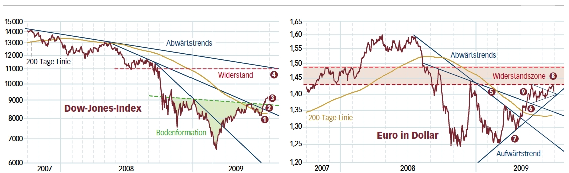 Ein ganz anderes Bild liefert die Markttechnik. Der drastische Anstieg seit den Tiefs im März bei 666 Punkten mutiert immer mehr zu einer mittelfristigen Umkehrformation. Wichtig in diesem Zusammenhang ist der Widerstandsbereich bei 950 bis 1010 Punkten. Nur wenn dieser nachhaltig – also auch mit deutlich anziehendem Handelsvolumen – gebrochen würde, wäre die Bodenbildung des Index abgeschlossen und ein neuer Aufwärtstrend etabliert. Das langfristige Kursziel gäben dann die alten Höchststände vor. Daneben wäre auch der im Jahre 1975 begründete primäre Aufwärtstrend erneut bestätigt, was aus technischer Sicht