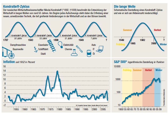 sind die damit befassten Firmen noch zu klein, um genügend Kapital für Investitionen, Wachstum und damit Millionen neuer Jobs zu bekommen. Noch ist Geduld gefragt. Wenn eine Volkswirtschaft das Stadium des Übergangs vom Winter ins Frühjahr erreicht, bleibt Kondratieff zufolge nichts weiter übrig als abzuwarten. Vermögensverwalter Alexander Seibold bestätigt das: „Wenn ein Zyklus zu Ende geht, gibt es keinen klaren