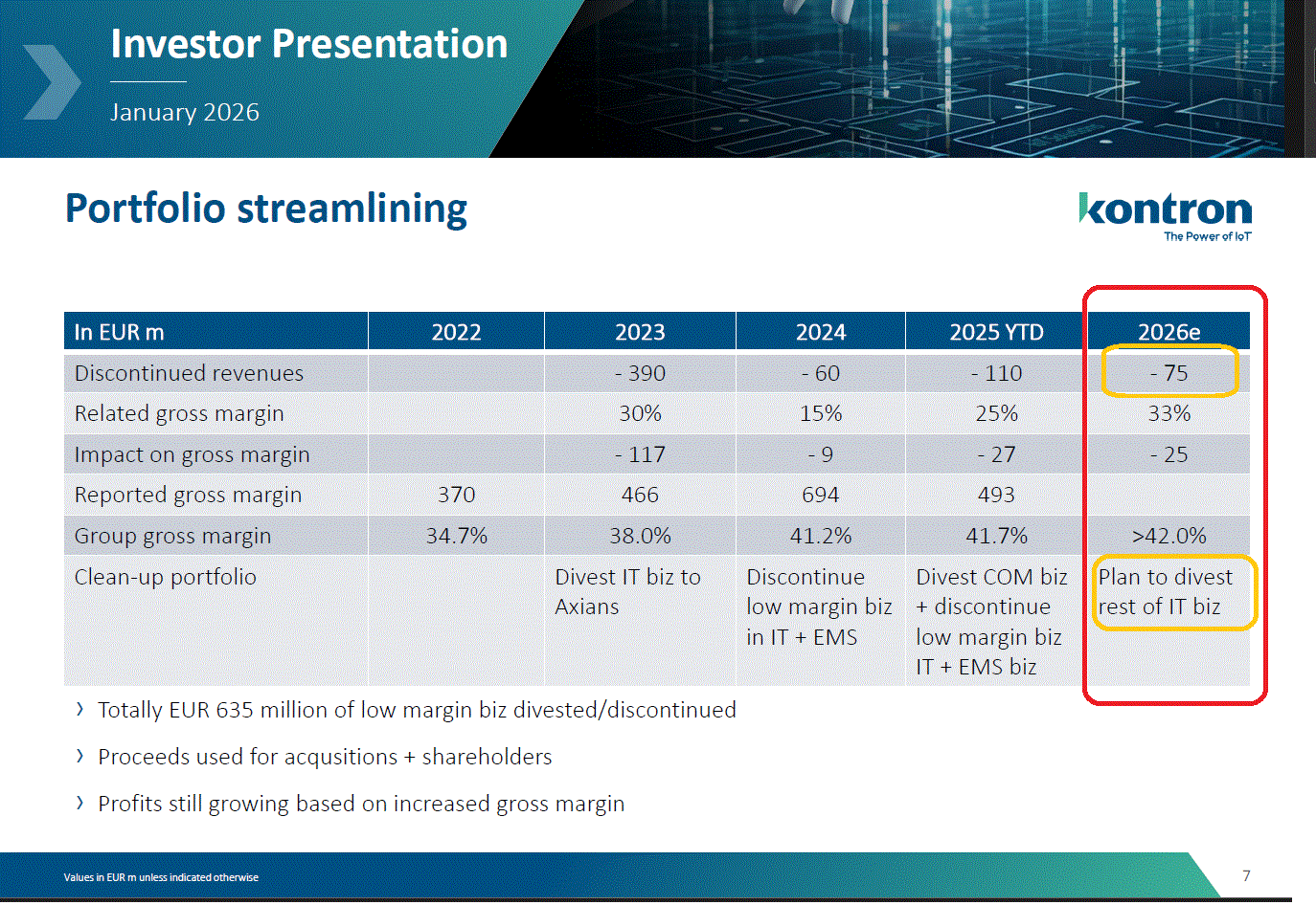 Muß nicht zwangsläufig in neue Übernahmen gesteckt werden, da man alternativ auch in seinen organischen Bestand deutlichere Investitionen tätigen könnte die später entsprechende Umsatzschübe dann ebenfalls erzeugen könnten. Zudem ist auch der Portfolio-Umbau noch nicht abgeschlossen. Für 2026 ist geplant weitere Bereiche mit ca. 75 Mio. Euro Umsatz abzugeben. ( den Rest des IT Geschäfts). Da muß man mal abwarten wie lange man dafür in diesem Jahr brauchen wird bis zum Verkauf und zu welchem Preis. Aber natürlich wäre es auch nicht überraschend, wenn es auf der Übernahmeseite dann kleiner Ergänzungen geben würde. Wichtig wäre halt bei solchen Zukäufen auch Synergien zu schaffen.