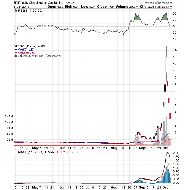IGC hat mit zwei US Brokerfirmen - Benchmark Company LLC, NYC und ViewTrade Securities Inc, Boca Raton - einen Deal zum Vertrieb ihrer Aktien abgeschlossen. Mukunda hat wohl seinen gesamten Aktienbestand an diese beiden Firmen übertragen. Laut fincance.yahoo sollen 33,26 Mio. Aktien in Umlauf sein, doch angesichts der Volumina von Ende September/Anfang Oktober ist hier Zweifel angebracht. Aktuell ist die Firma mit 135 Mio. USD kapitalisiert, liegt jedoch - wie schon seit Jahren - immer noch erheblich in der Verlustzone.