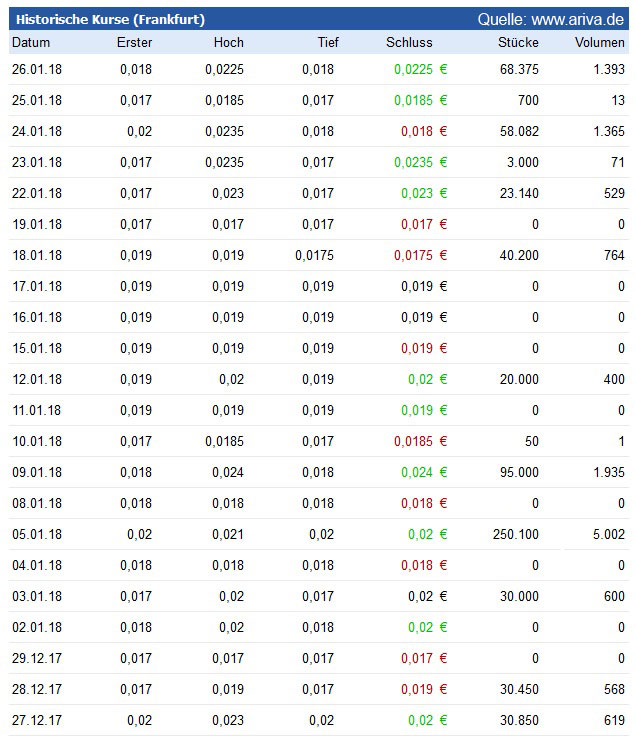 Zitat tbhomy: Zitatanfang: "......Falls sie stärker abverkaufen,könnte der Kurs vermutlich sogar unter 0,01 Euro rauschen, befürchte ich. :-(......" Zitat Ende