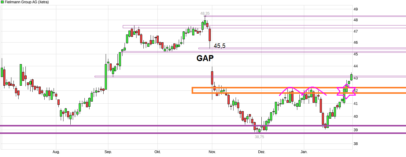 Im Chart steckt man jetzt in der nächsthöheren horizontalen Range von ca. 44 bis knapp unter 46€. Dabei ist man jetzt schon sehr nach an diese Obergrenze gelaufen. Bleibt abzuwarten, ob man vor den endgültigen Zahlen diese Marke oben auch noch herausnehmen kann. Falls ja, dann wäre das nächste Fenster auf bis ca. 48,35€. Also vor mir aus muß es garnicht in solchen schnellen Schritt hochgehen. Mir wäre schon Recht, wenn sich der Gesamttrend einfach weiter nordwärts bewegt und später irgendwann dann auch mal wieder den 50er Bereich beschnuppert.