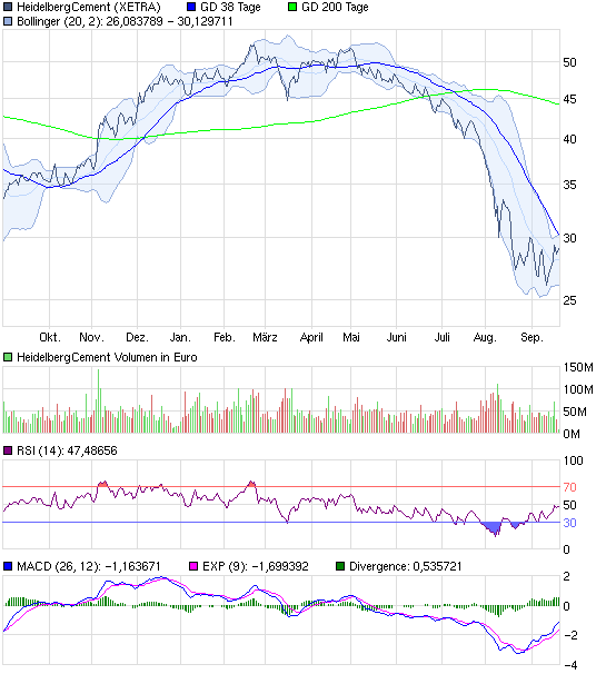 Im täglichen Geschäft merkt die Gesellschaft bisher noch nicht von den Krisen an den Finanzmärkten. Sowohl im August als auch im September geht der Umsatz weiter nach oben. Auch in einem wortst-case-Szenario, das HeidelbergCement durchgespielt hat, würde man das operative EBITDA von 2009 erreichen können. Damals lag der Wert bei 2,1 Milliarden Euro. Damals hatte man mit Kosteneinsparungen gerade erst begonnen. Heute kann die Gesellschaft von diesen Maßnahmen profitieren. Die Investitionsentscheidungen werden unter die Lupe genommen, um sich für eine Krise vorzubereiten. Die Analysten sehen jedoch mehr Aufwärts- als Abwärtspotenzial für den Wert. Sie loben das gute Management. Auch ist die Marktposition stark.